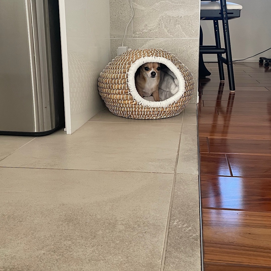 散歩ぎらい 寒すぎて、散歩拒否中のキャラたん「散歩いくよー」って言うとブルブル震え出す(笑)半強制的に連れ出すと敷地内でまず踏ん張り仕方なく抱っこで行くも下ろすと家に戻ろうとして帰り道はリードをグイグイ引っ張って生還wさ、この中から引っ張り出して散歩行ってきます